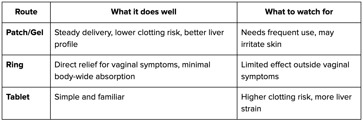 How estrogen enters the body changes the outcome. Pills move through the gut and liver, which raises clotting factors and strains metabolism. Patches and gels deliver through the skin and bypass that first pass. Rings act locally for dryness but won’t touch bone or muscle.