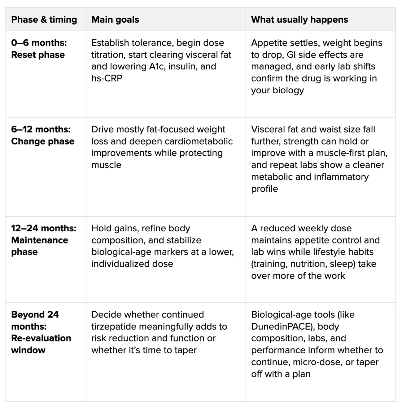Tirzepatide for anti‑aging works best as a structured, time‑bound calibration — an intensive reset, a maintenance window, and then a data‑based decision about tapering or continuing.