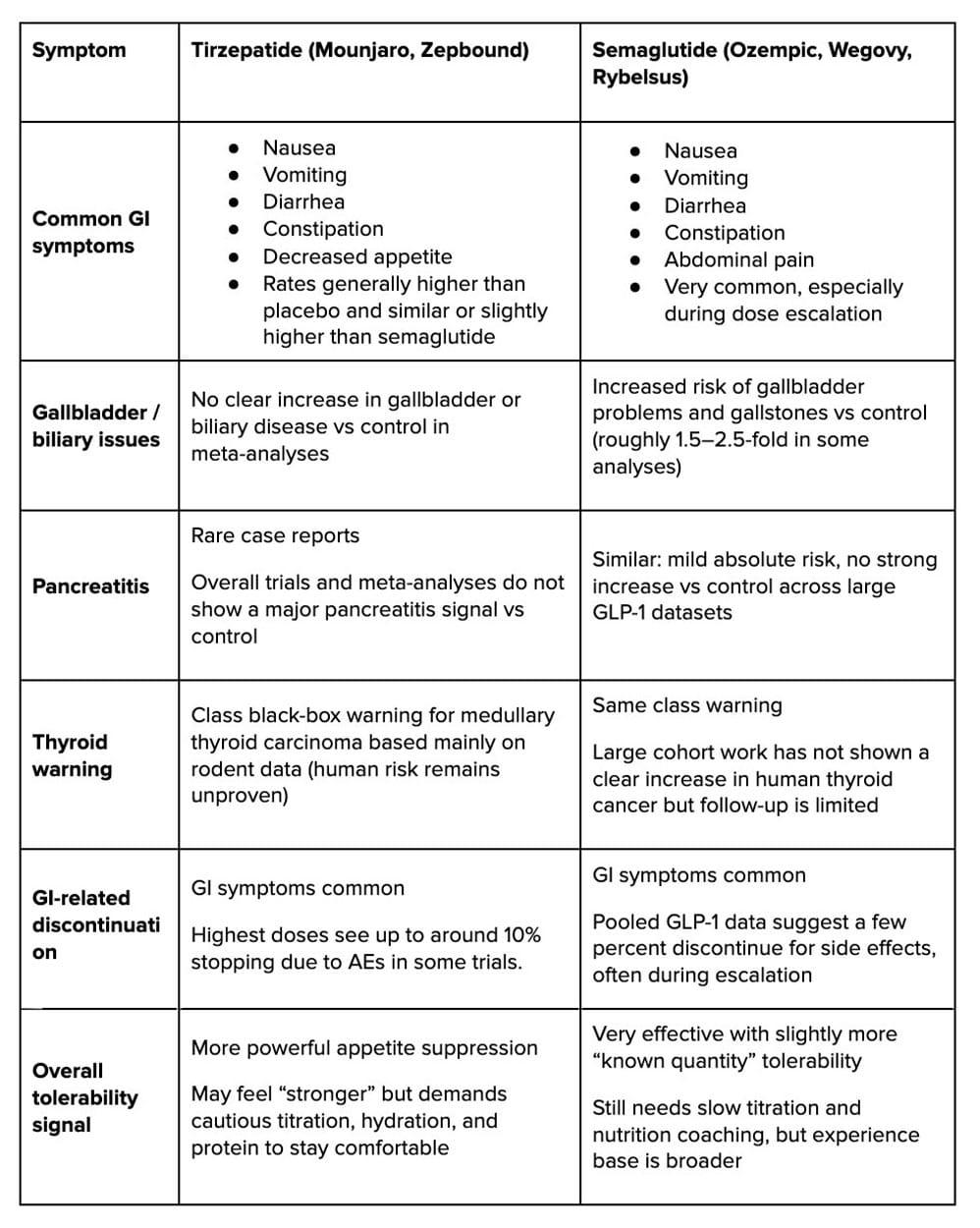 Both tirzepatide and semaglutide cause the familiar GLP‑1‑style side effects — mainly gut upset and rare gallbladder or pancreas issues — but tirzepatide tends to feel stronger on appetite and GI intensity, while semaglutide carries a slightly higher gallbladder signal and the longer real‑world safety track record.
