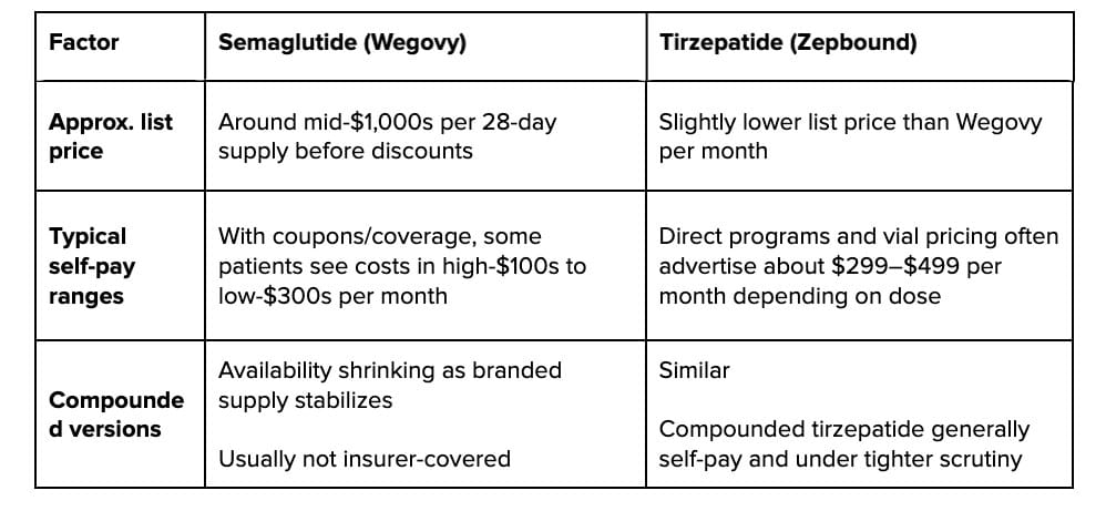 When a plan covers anti‑obesity meds, out‑of‑pocket costs for the two are usually in the same ballpark. But when it doesn’t, both are essentially unaffordable unless a manufacturer savings card applies. And those cards are temporary, rule‑heavy, and can disappear or tighten at any time, so no “cheaper” label is guaranteed long term.